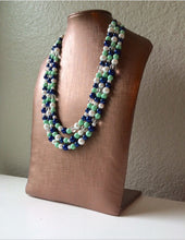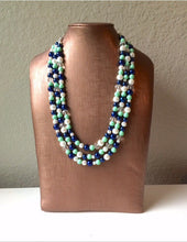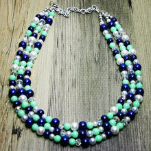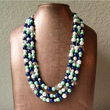 17 Inch Necklace with a 4 inch silver extender chain and silver lobster clasp. Mint, navy, and white pearls and beads adorn this chunky 3 strand necklace. I also added in some clear glass crystals for some shimmer :-)