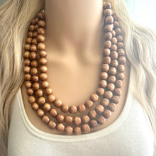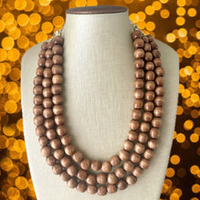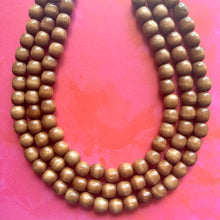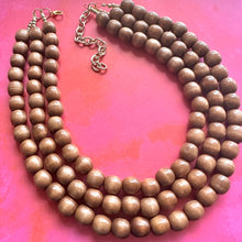 Simply Gorgeous!! 3 strands for an extra chunky statement look. These beads are made from real wood, and a light wax is applied so they are smooth as silk. A subtle wood marbling is present in each bead.