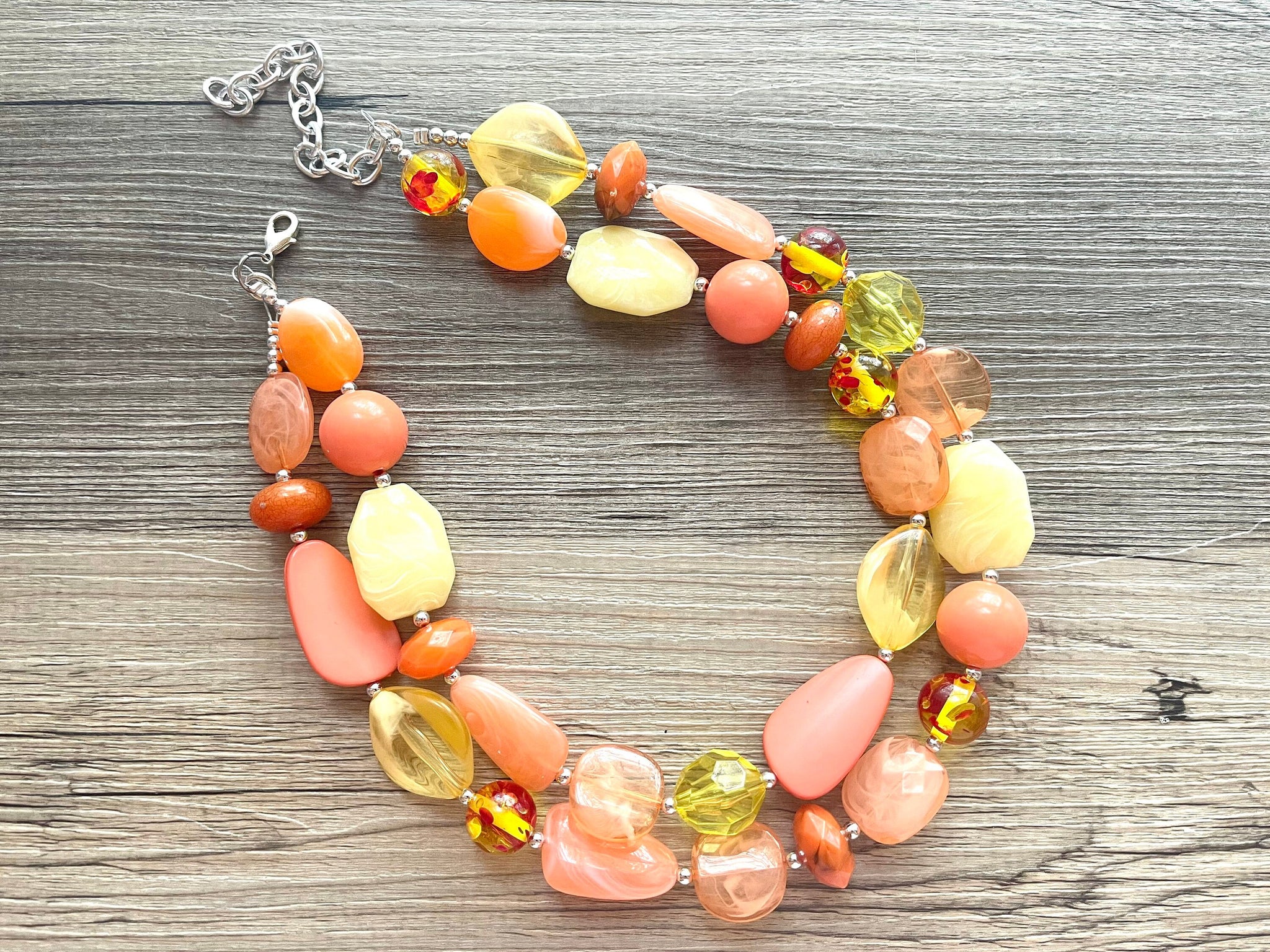 Dress up any outfit - great for a night out or with a white tee! 17 Inch Necklace with a 4 inch silver extender chain and silver lobster clasp. This is an eclectic bunch of acrylic beads in coral, orange, and yellow. A total conversion starter!