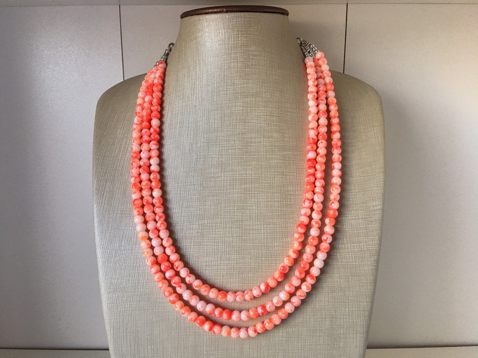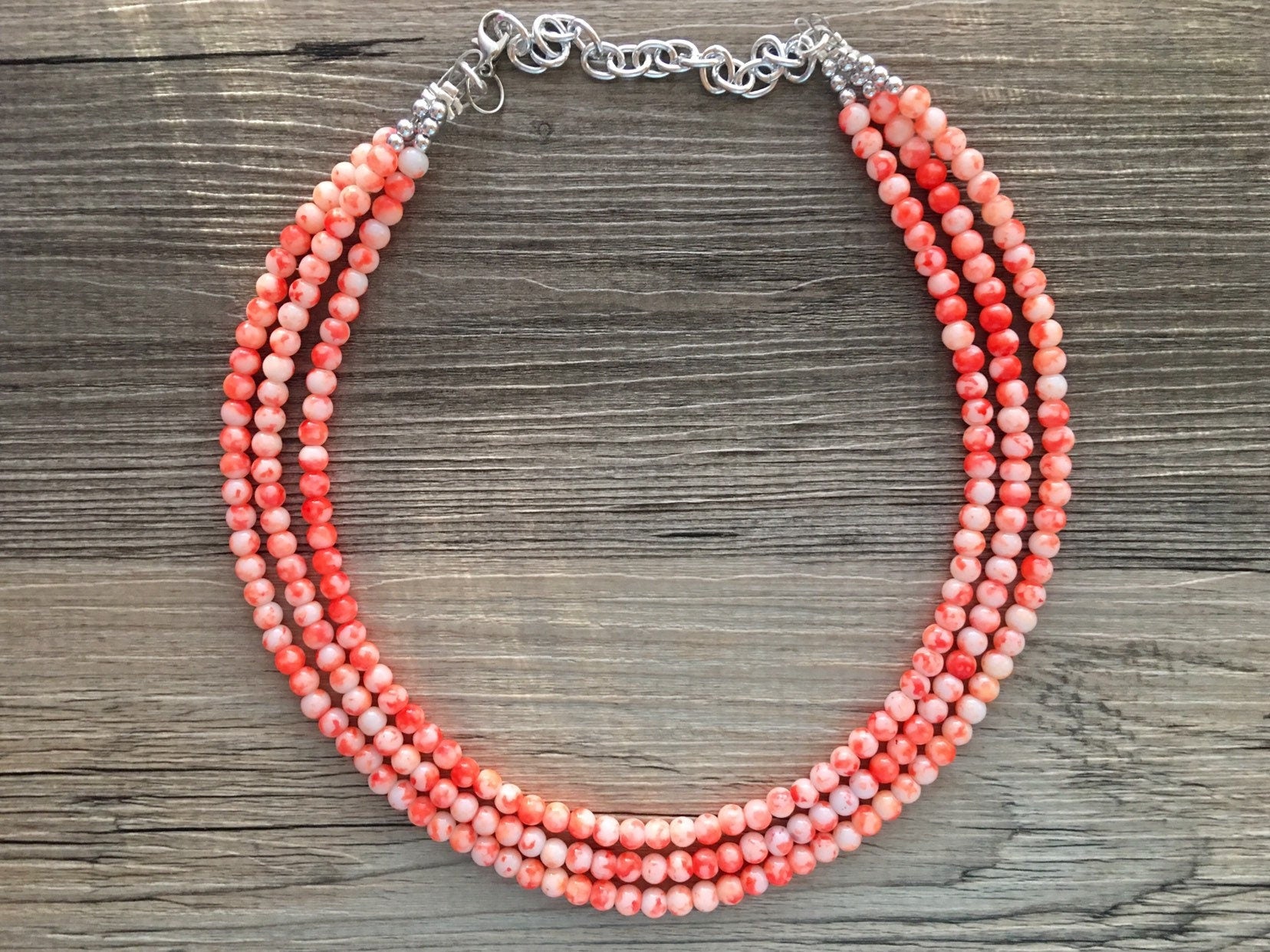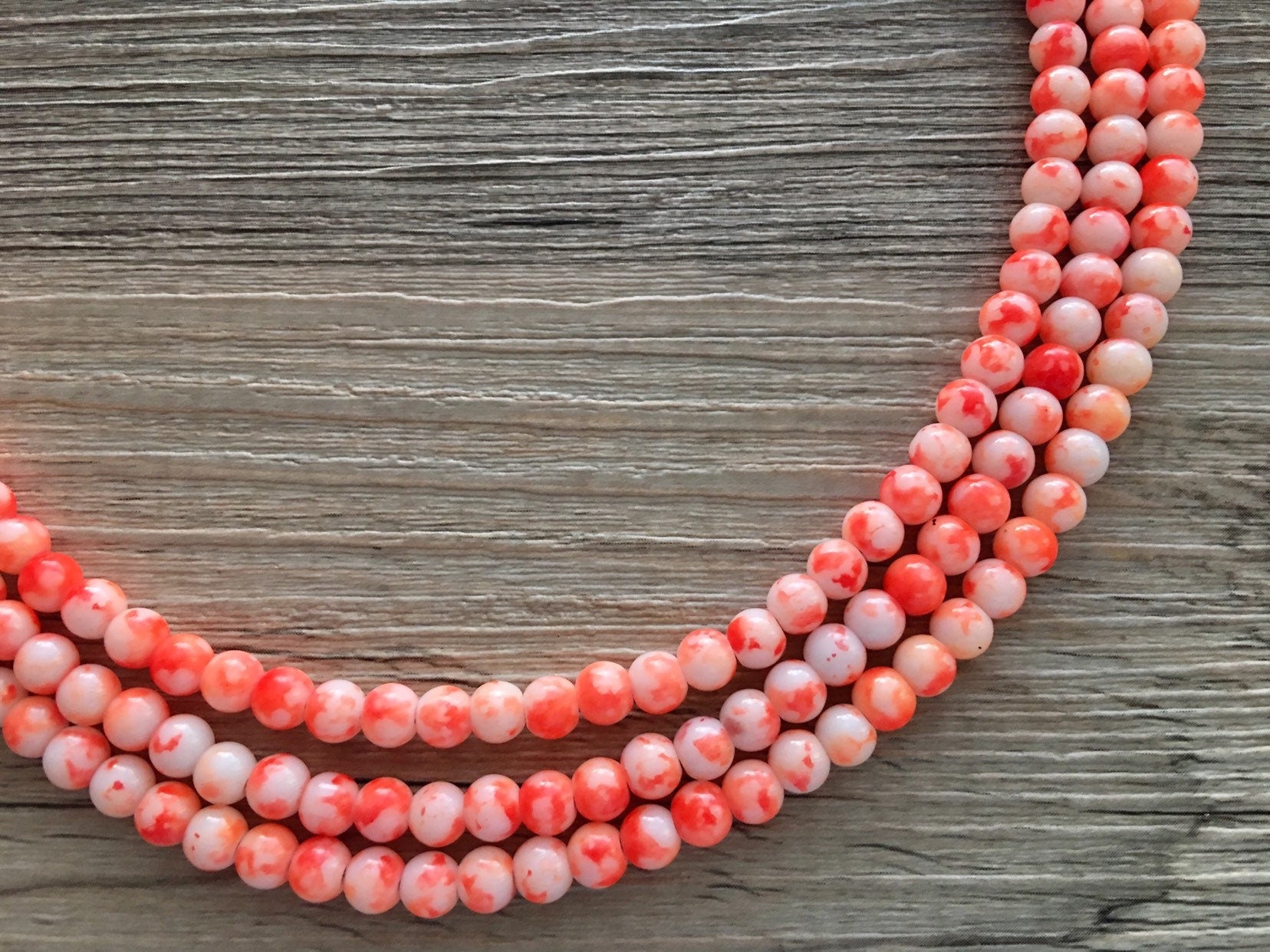 We love this orange + white necklace, made with acrylic “tie dye” beads. It is 16” plus a 4” extender chain.