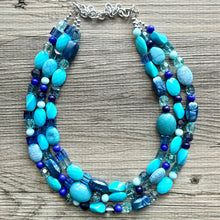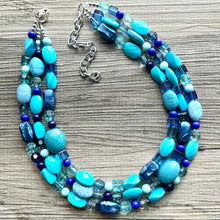 Ocean Blue 3 strand Beaded Statement Necklace, Chunky Bib Multi-Strand Jewelry, blue drop earrings, neutral necklace turquoise aqua navy