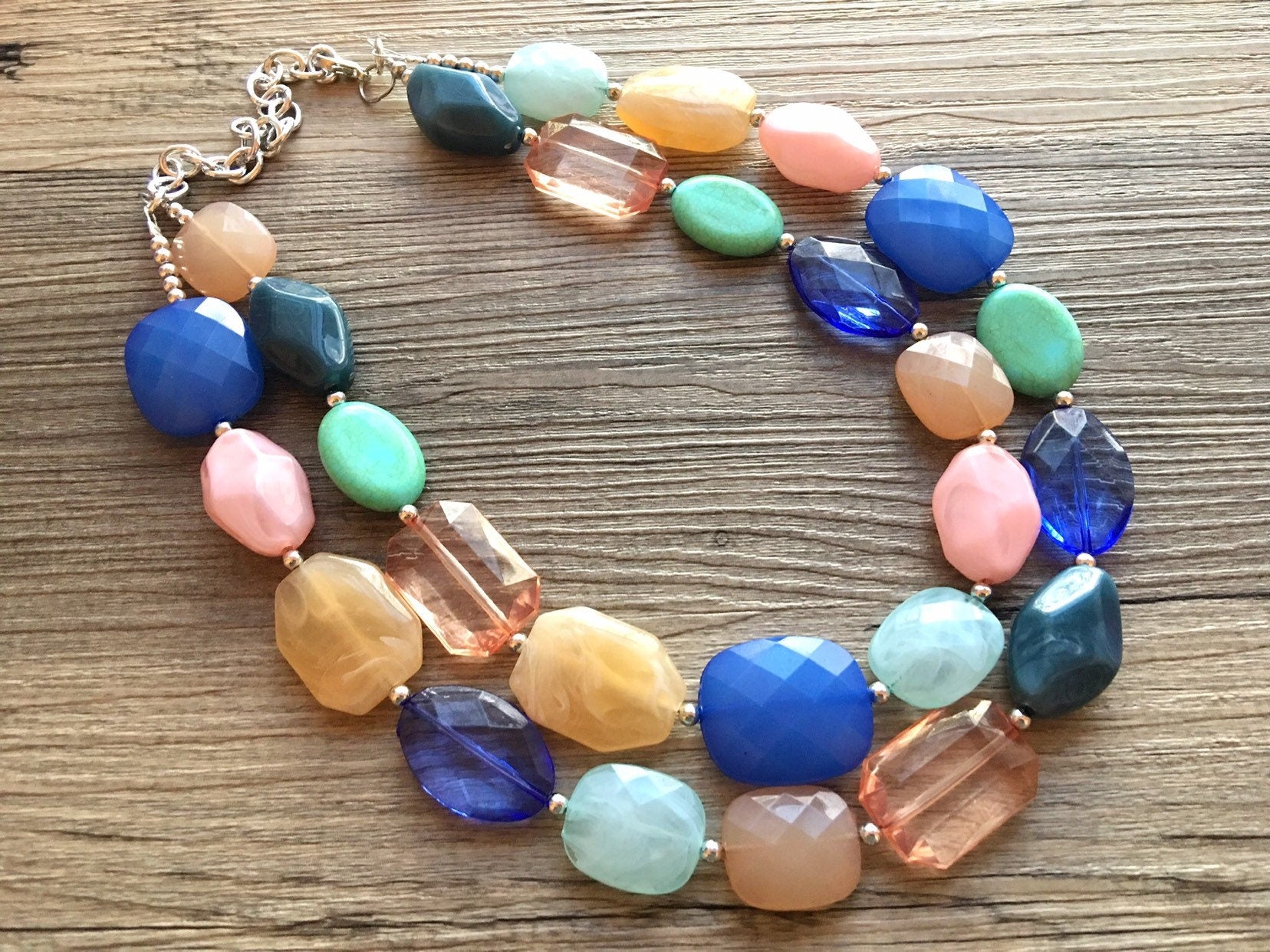 Peachy Ocean Breeze Statement Necklace, chunky bib beaded jewelry, neutral jewelry, blue turquoise necklace, beaded acrylic jewelry