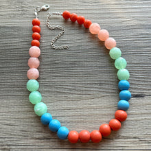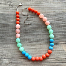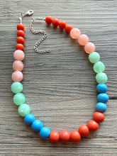 San Diego Chunky Statement Necklace, single strand bib beaded jewelry, aqua blue color block necklace, light green orange light blue jewelry