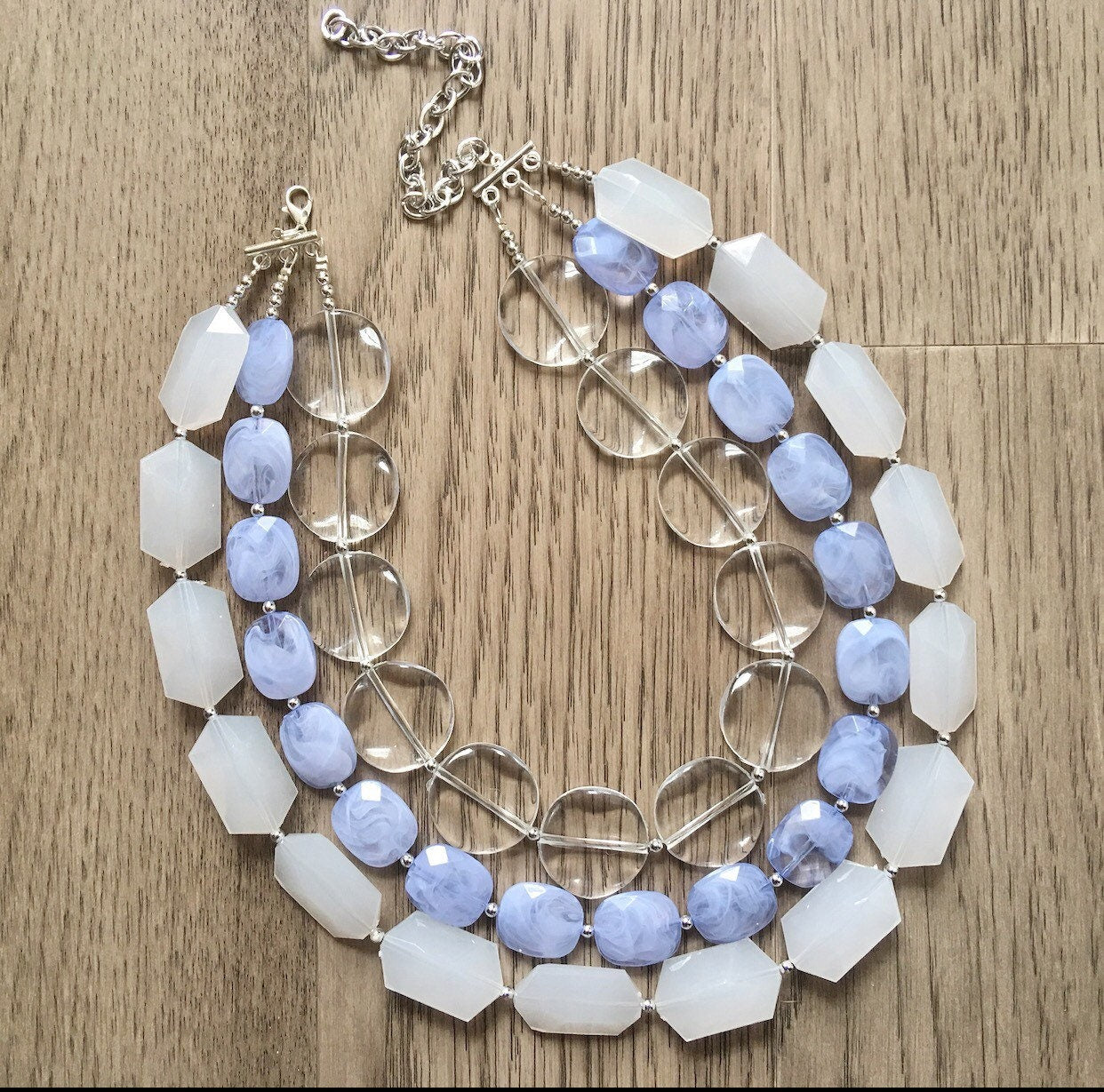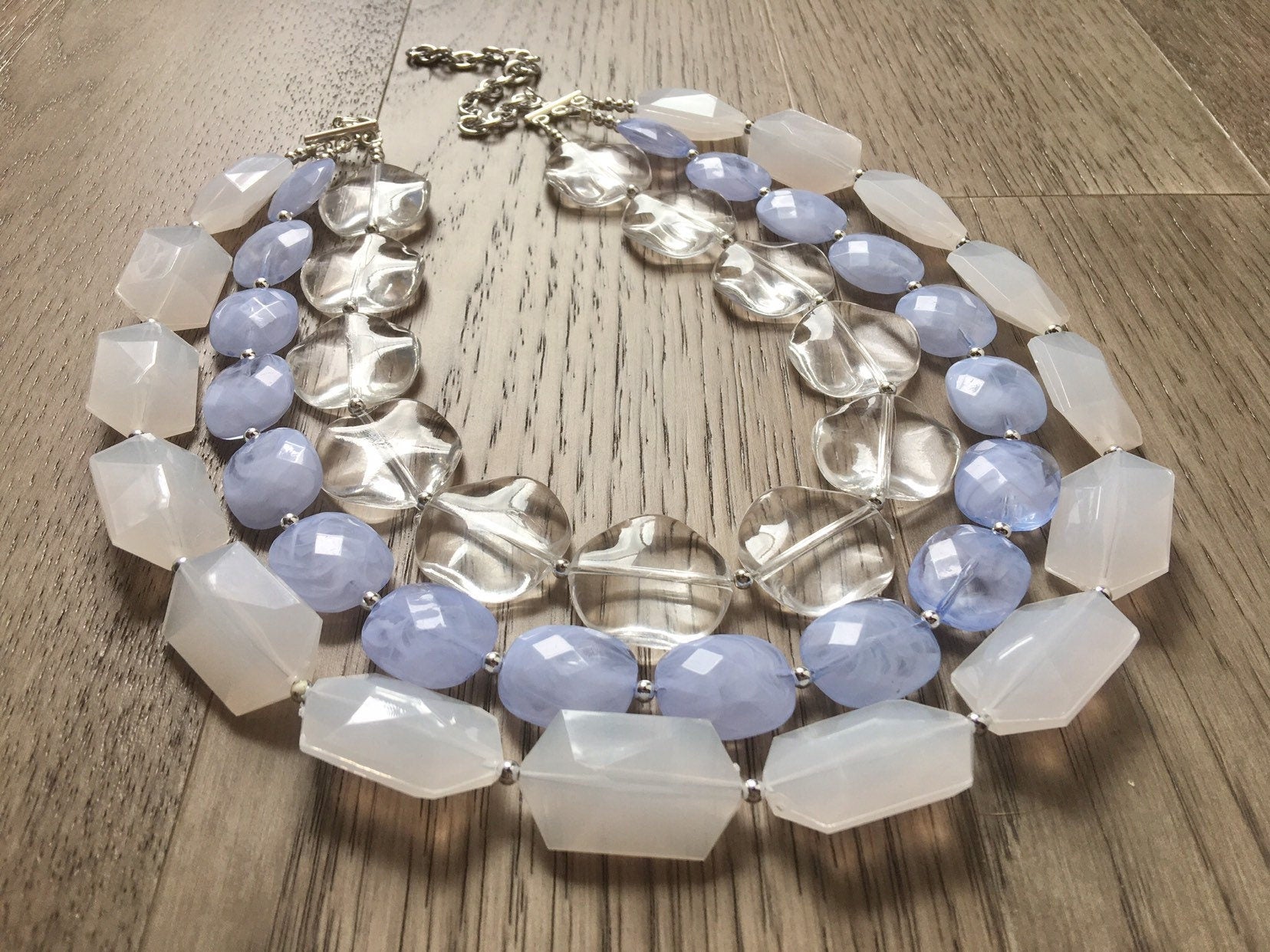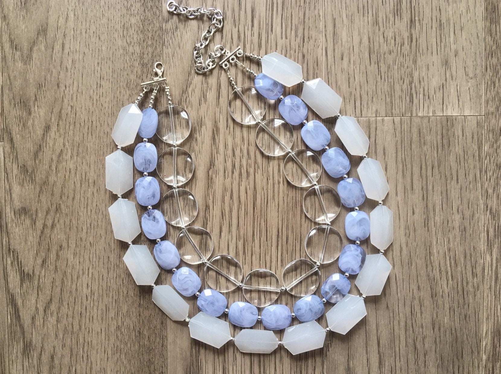 A fun mix of sky blue beads, clear circles, and white faceted acrylic beads. This makes a big statement - but not too heavy due to the mix of acrylic beads.