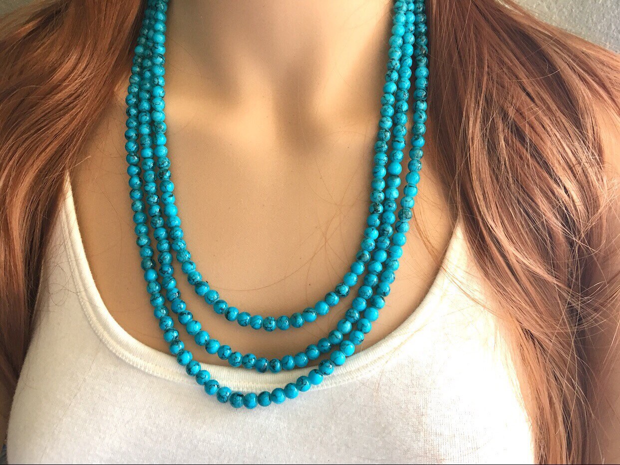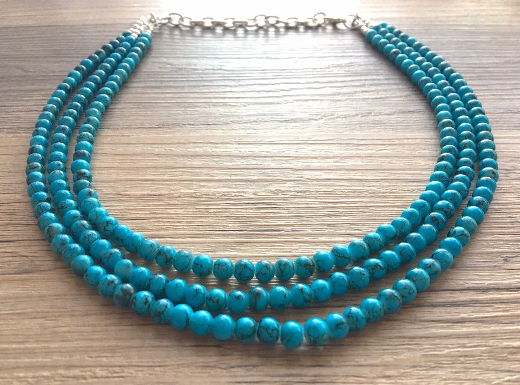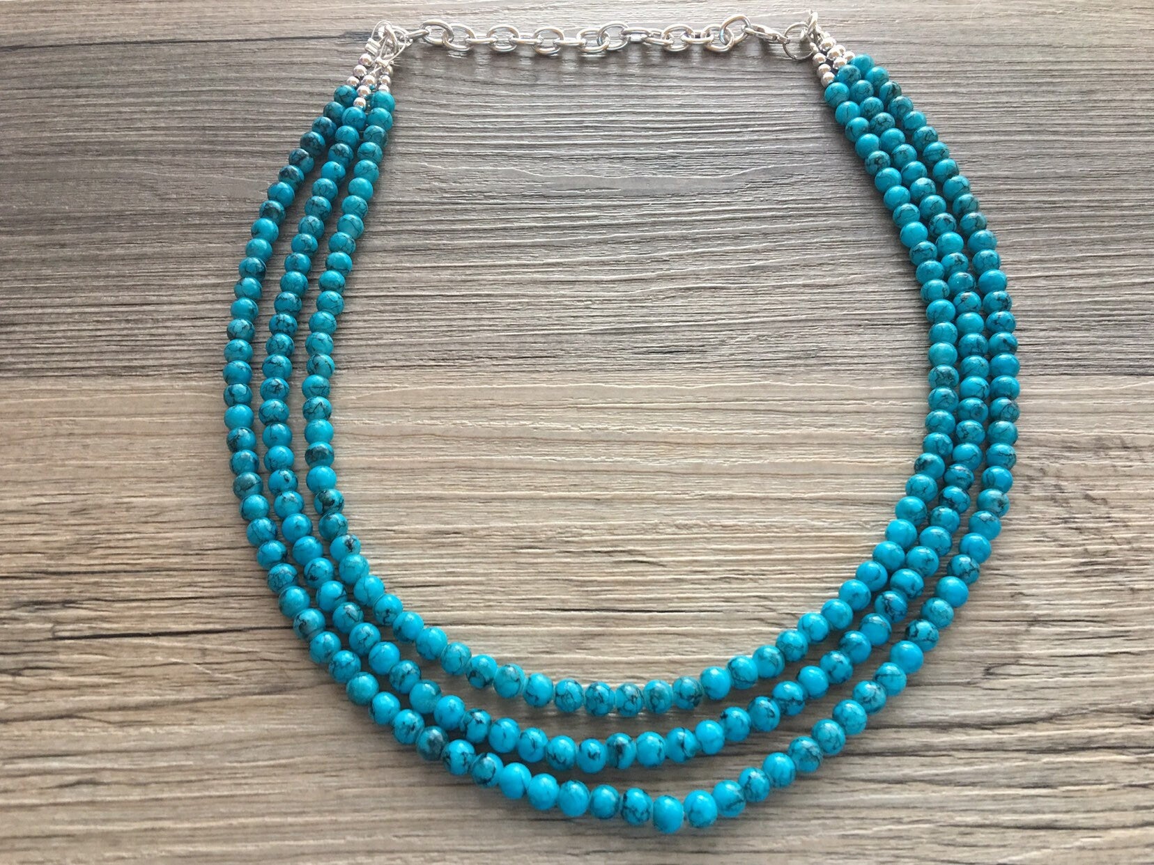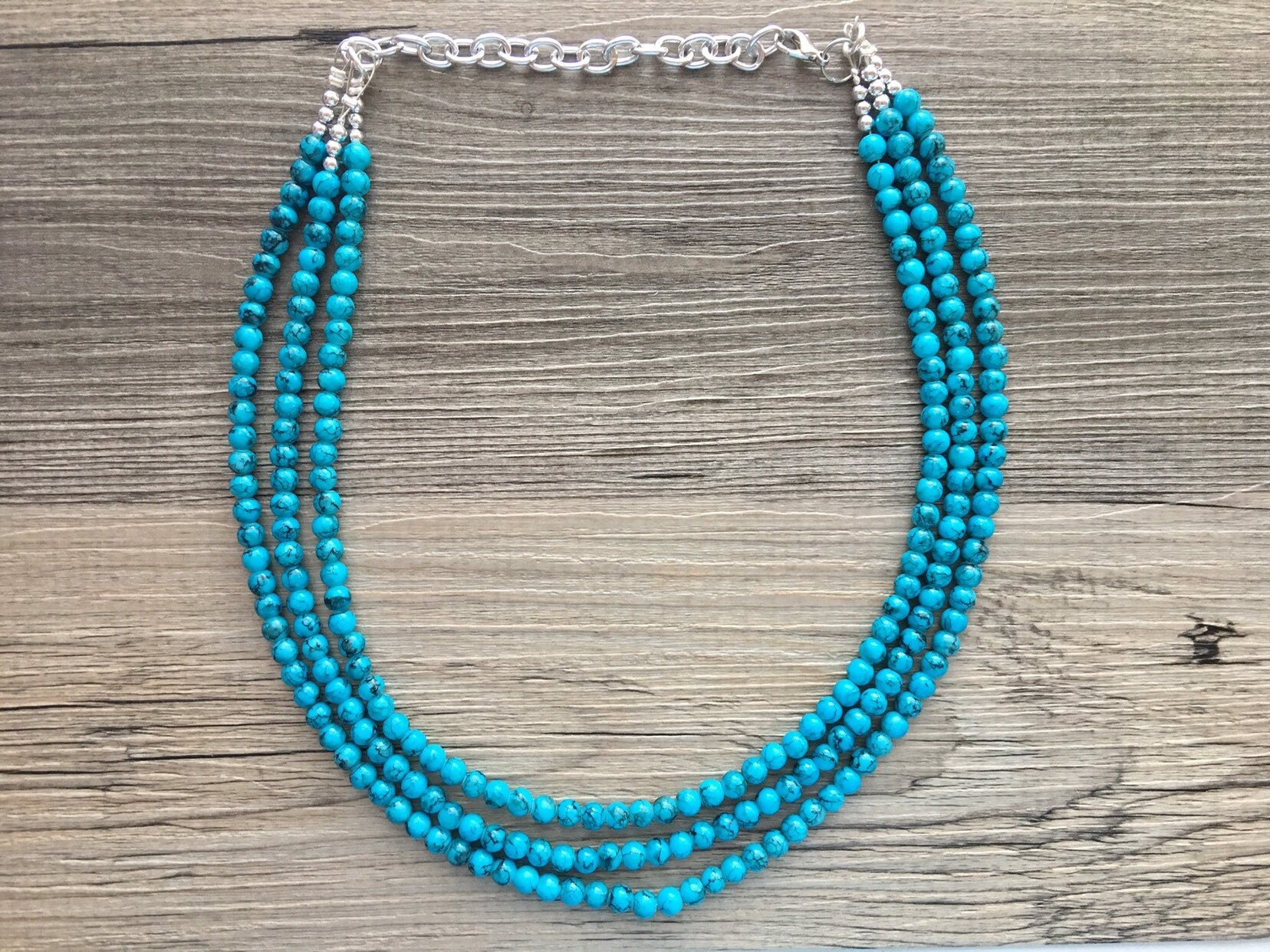 Teal Blue + Black 3 strand Beaded Statement Necklace, Chunky Bib white and Teal Multi-Strand Jewelry Light blue swirl beads ocean side