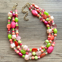 Dress up any outfit - great for a night out or with a white tee! 16 Inch Necklace with a 4 inch silver extender chain and silver lobster clasp. This is made with lime, pink, and coral acrylic beads. We add fun geometric beads too.