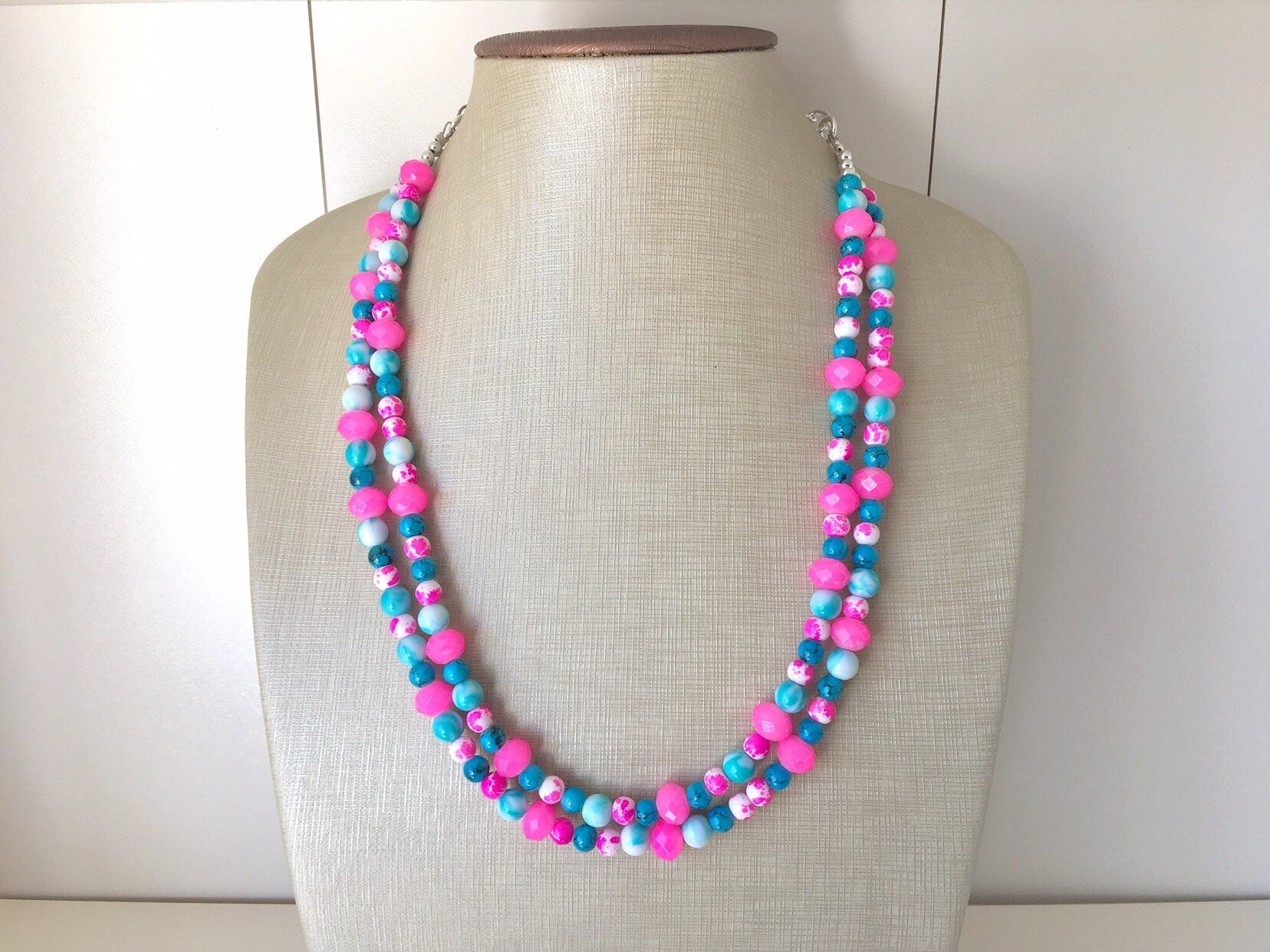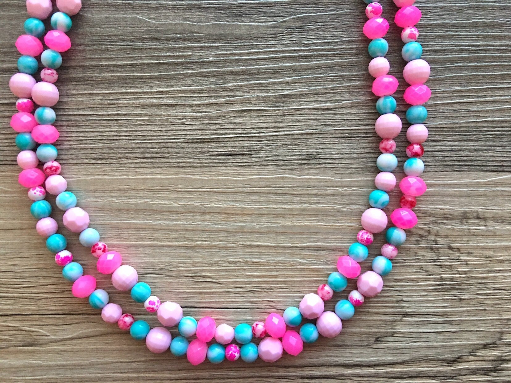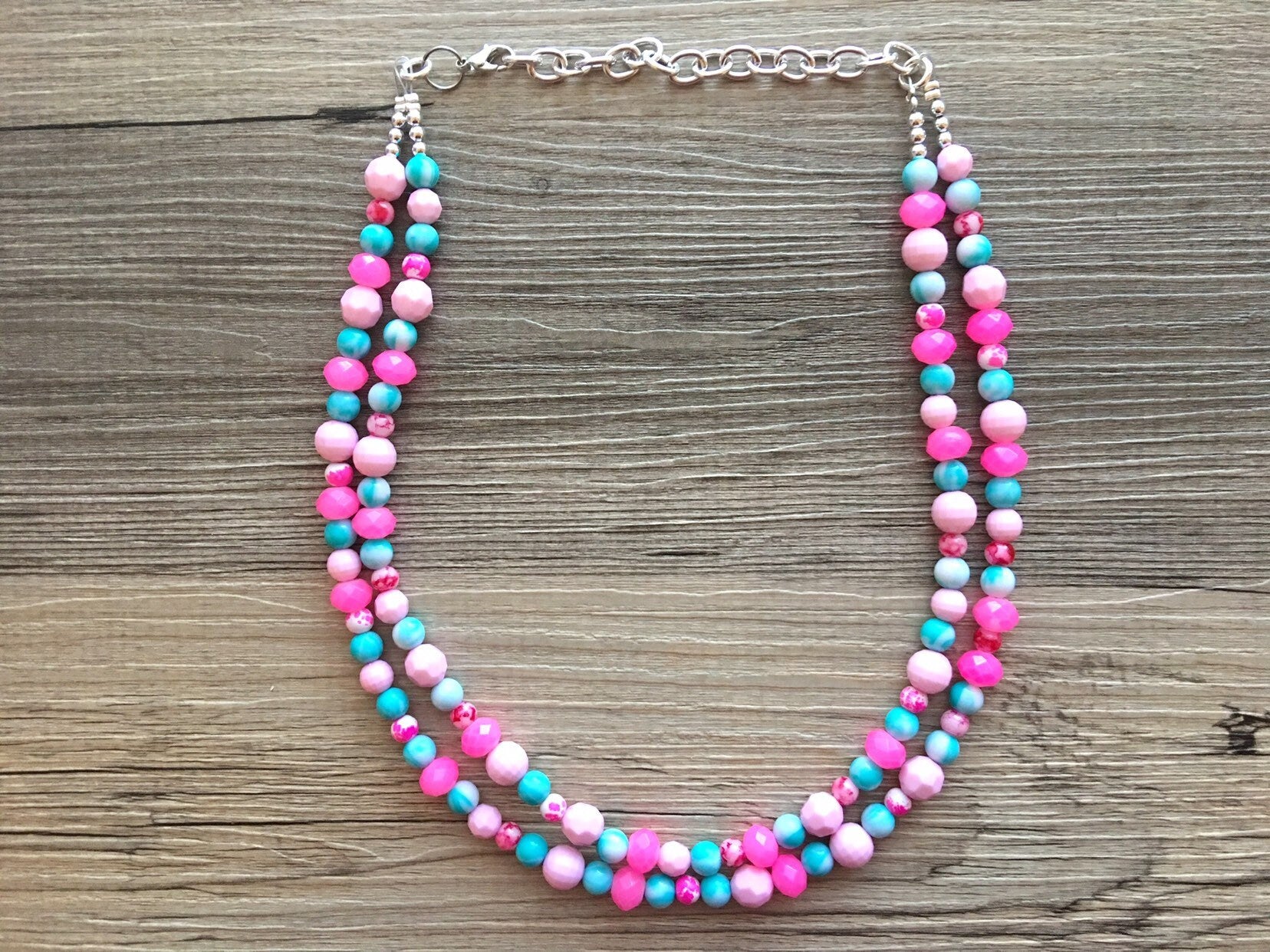 We love this teal blue + bright necklace, made with acrylic beads, neon glass crystals that seems to GLOW, and tie dye ceramic beads. It is 16” plus a 4” extender chain.