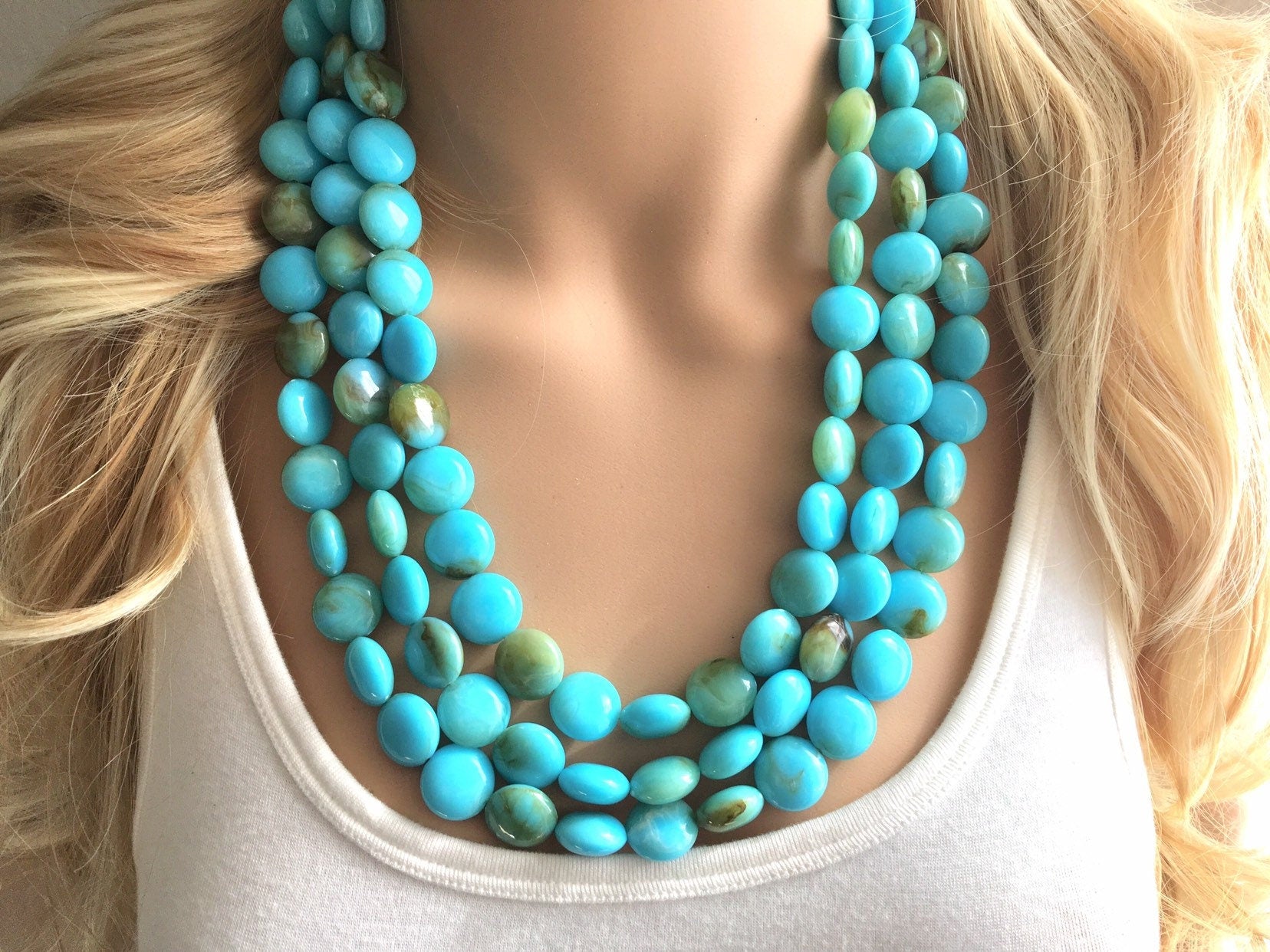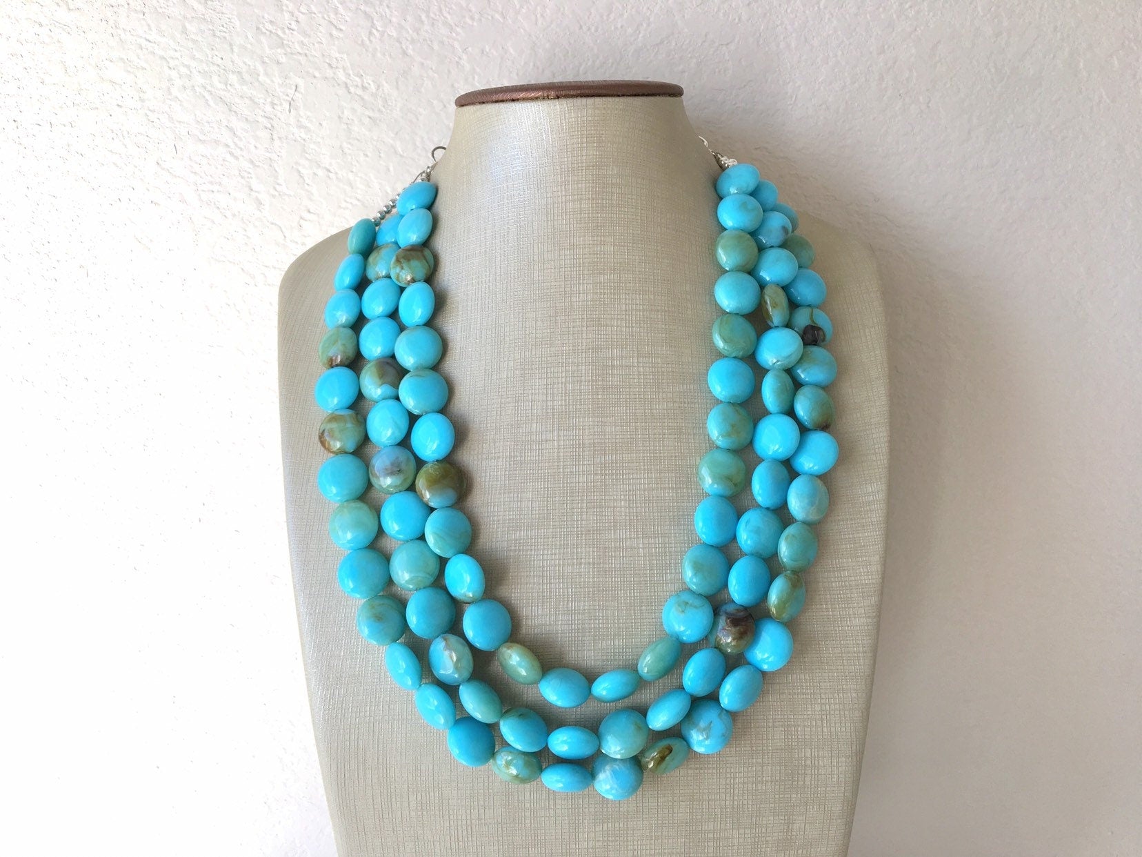 Swirly turquoise beads in a graduated style. No 2 beads are alike! This makes a big statement - very chunky and thick, but not too heavy due to the acrylic beads.