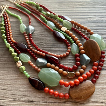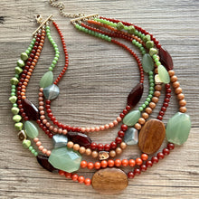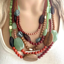 Vintage Vacation statement necklace, chunky bib beaded jewelry 5 strand neutral mint green red wood multi strand brown, Traveler Collection