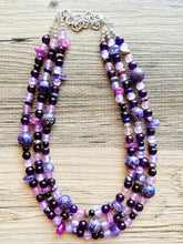 16 Inch Necklace with a 4 inch silver extender chain and silver lobster clasp. Shades of purple, polka dotted with black crystals and beads adorn this chunky 3 strand necklace. I also added in some clear glass crystals for some shimmer :-)