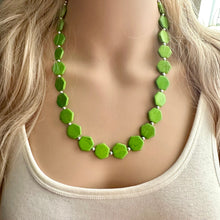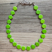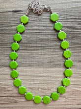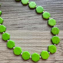 Bright Green Chunky Statement Necklace, Big beaded jewelry, 1 Strand Statement Bib necklace, silver geometric bridesmaid wedding earrings