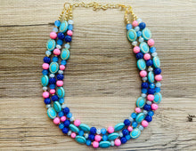 Dress up any outfit - great for a night out or with a white tee! 16 Inch Necklace with a 4 inch gold extender chain and gold lobster clasp. This is an eclectic bunch of acrylic beads in complimenting colors. A total conversation starter!