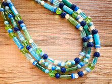 Dress up any outfit - great for a night out or with a white tee! 16 Inch Necklace with a 4 inch silver extender chain and silver lobster clasp. This is an eclectic bunch of acrylic beads and faceted glass statement crystals featuring shades of green and blue. Itโs a Dream come Blue ๐ A total conversation starter!