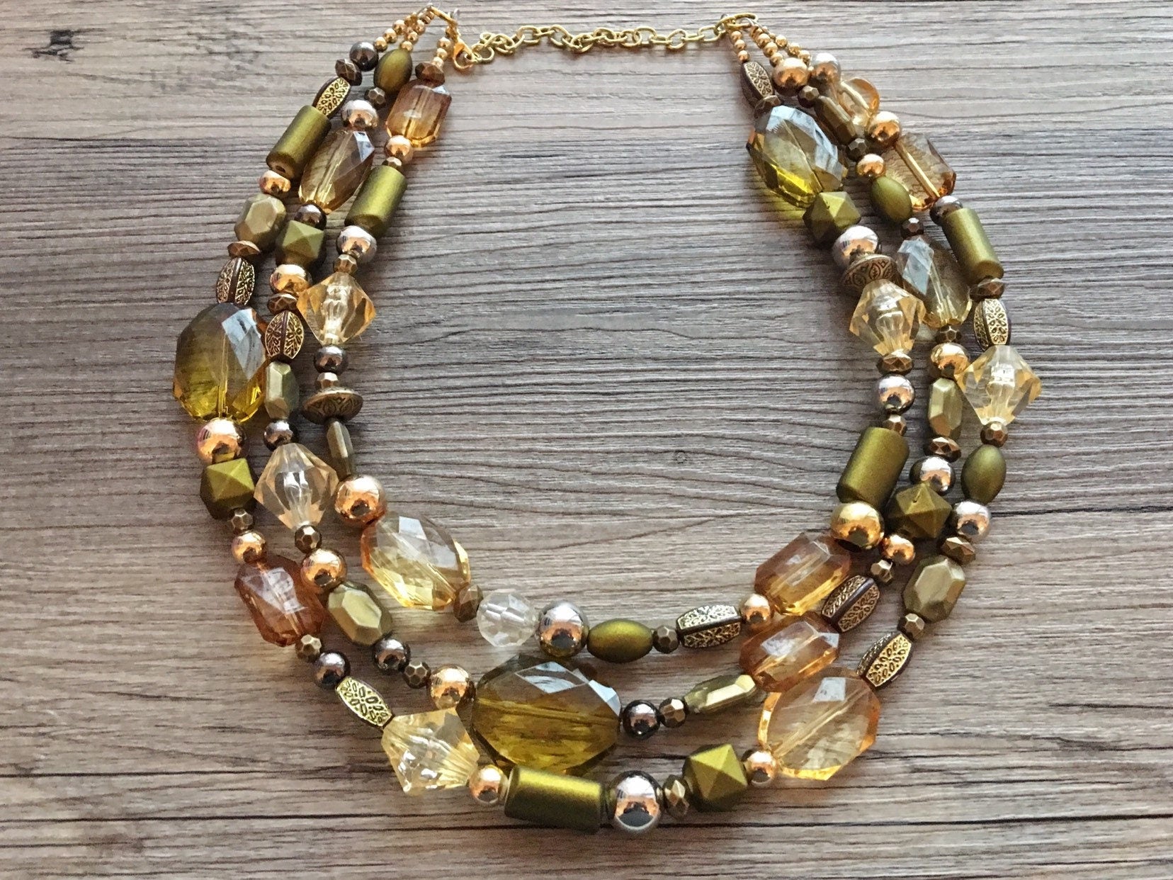 Metallic & Olive 3 Strand statement necklace, big beaded necklace, chunky jewelry, green necklace, gold necklace, multi-strand bib jewelry