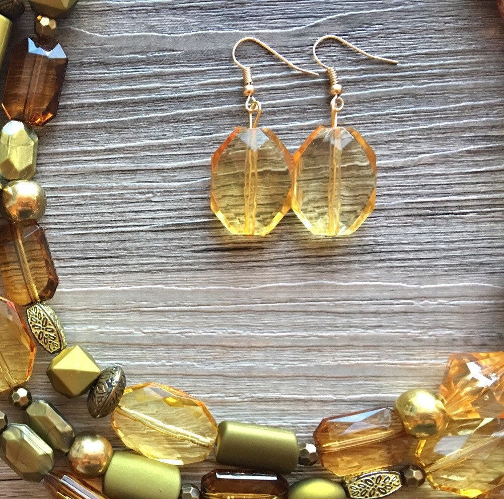 Dress up any outfit - great for a night out or with a white tee! 16 Inch Necklace with a 4 inch gold extender chain and gold lobster clasp. This is made with a collision of faceted gold and olive acrylic beads, bubble beads, faceted balls, and matte olive beads. It also features faceted gold acrylic smooth tube beads.