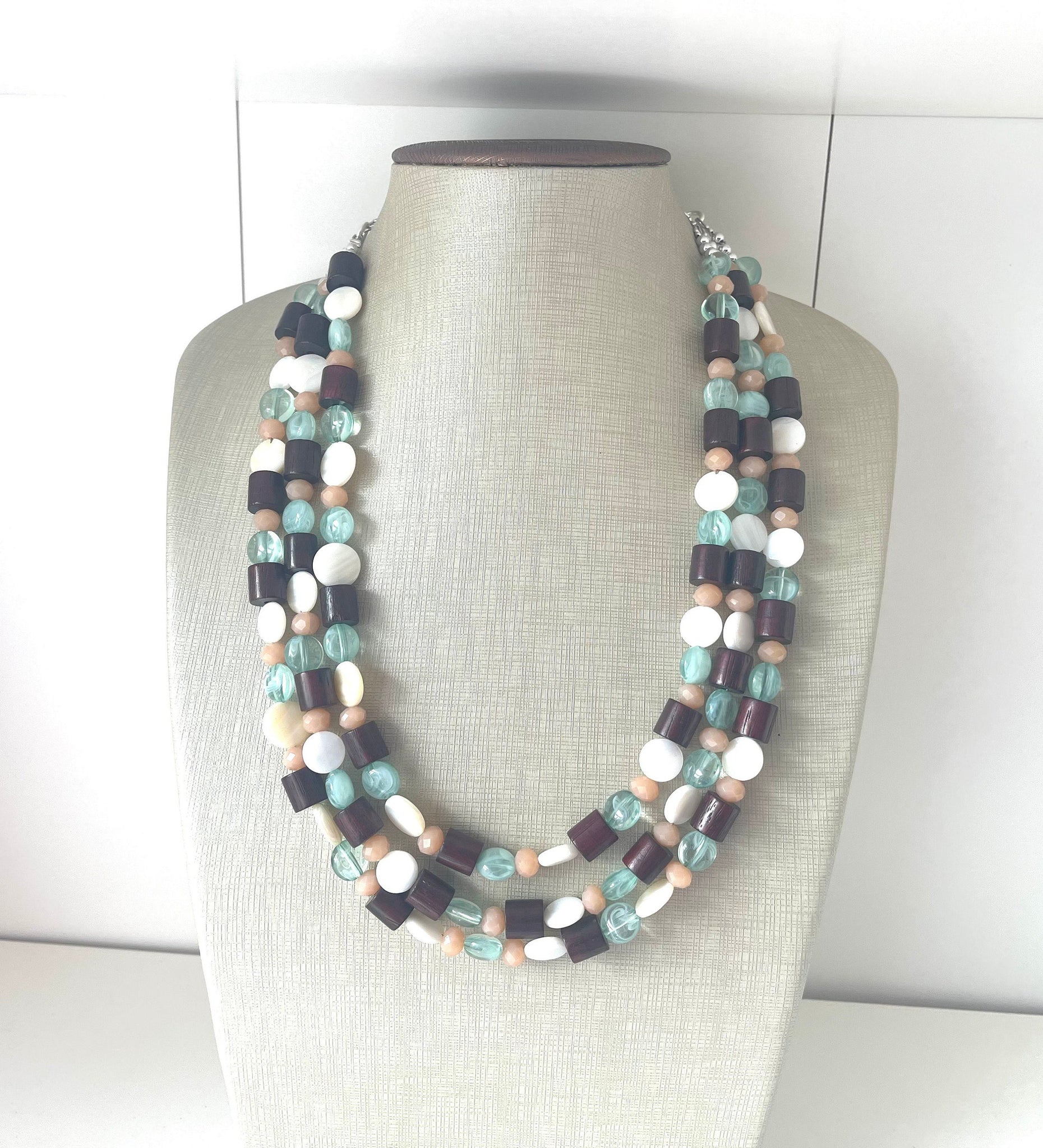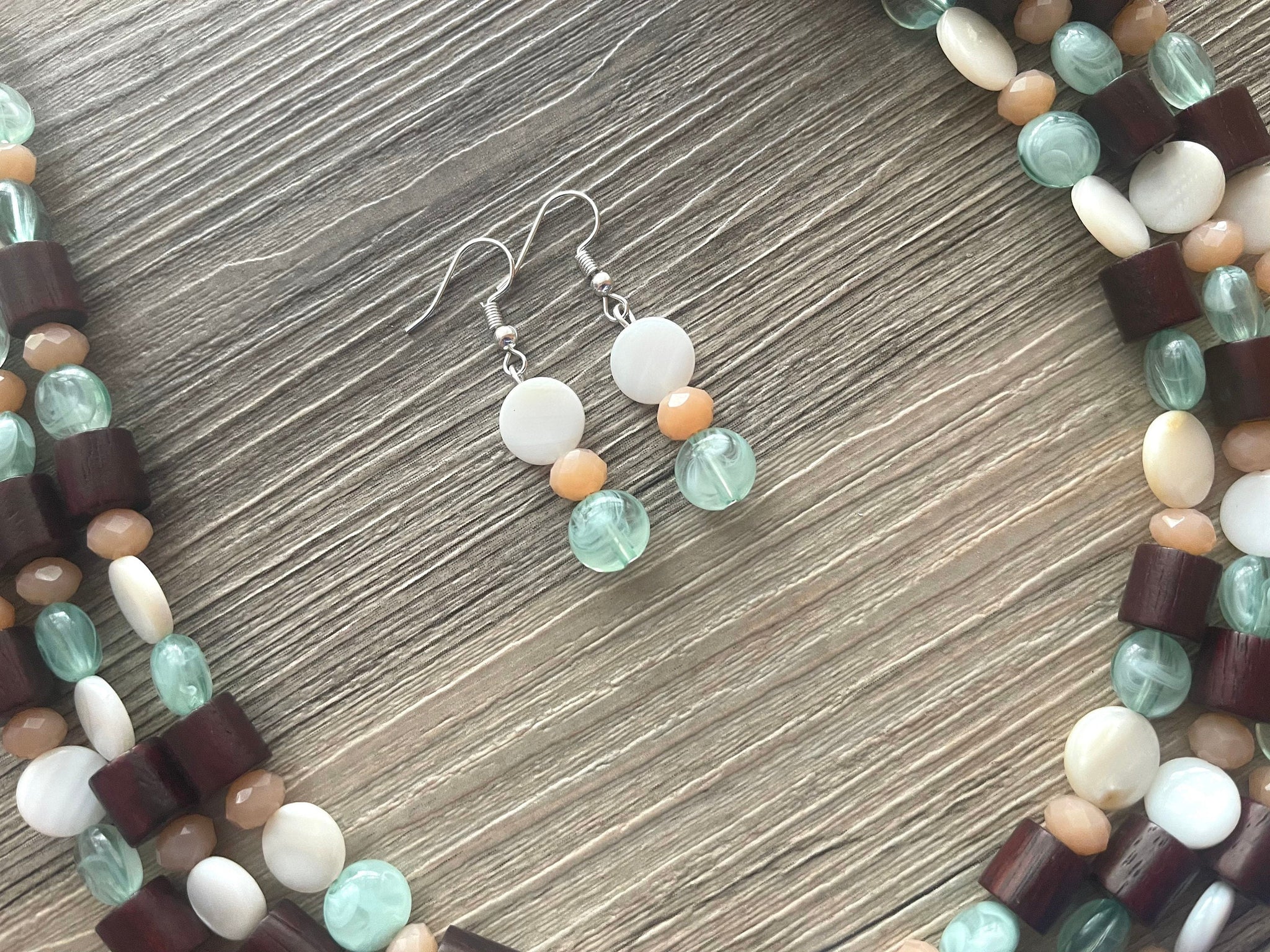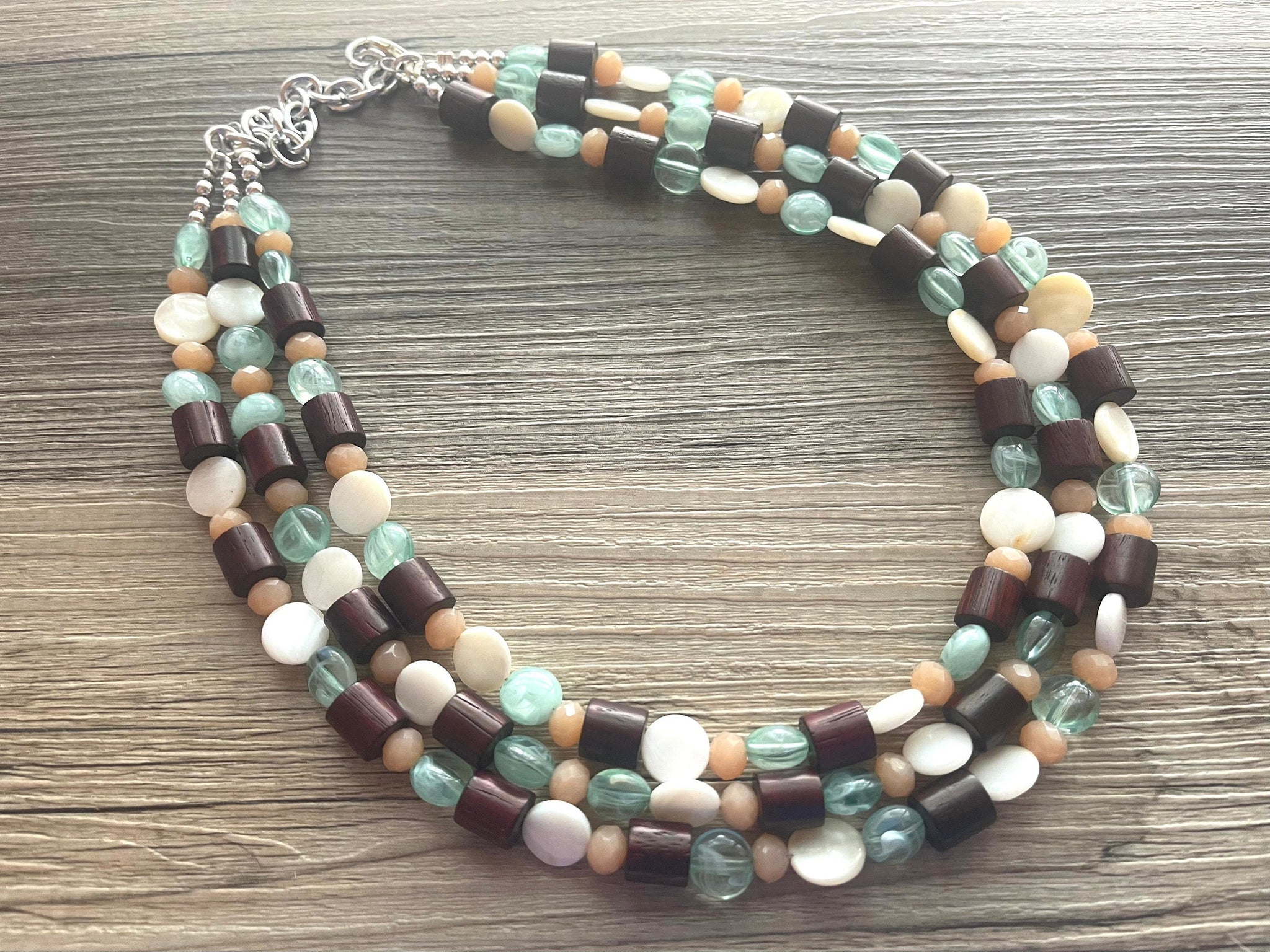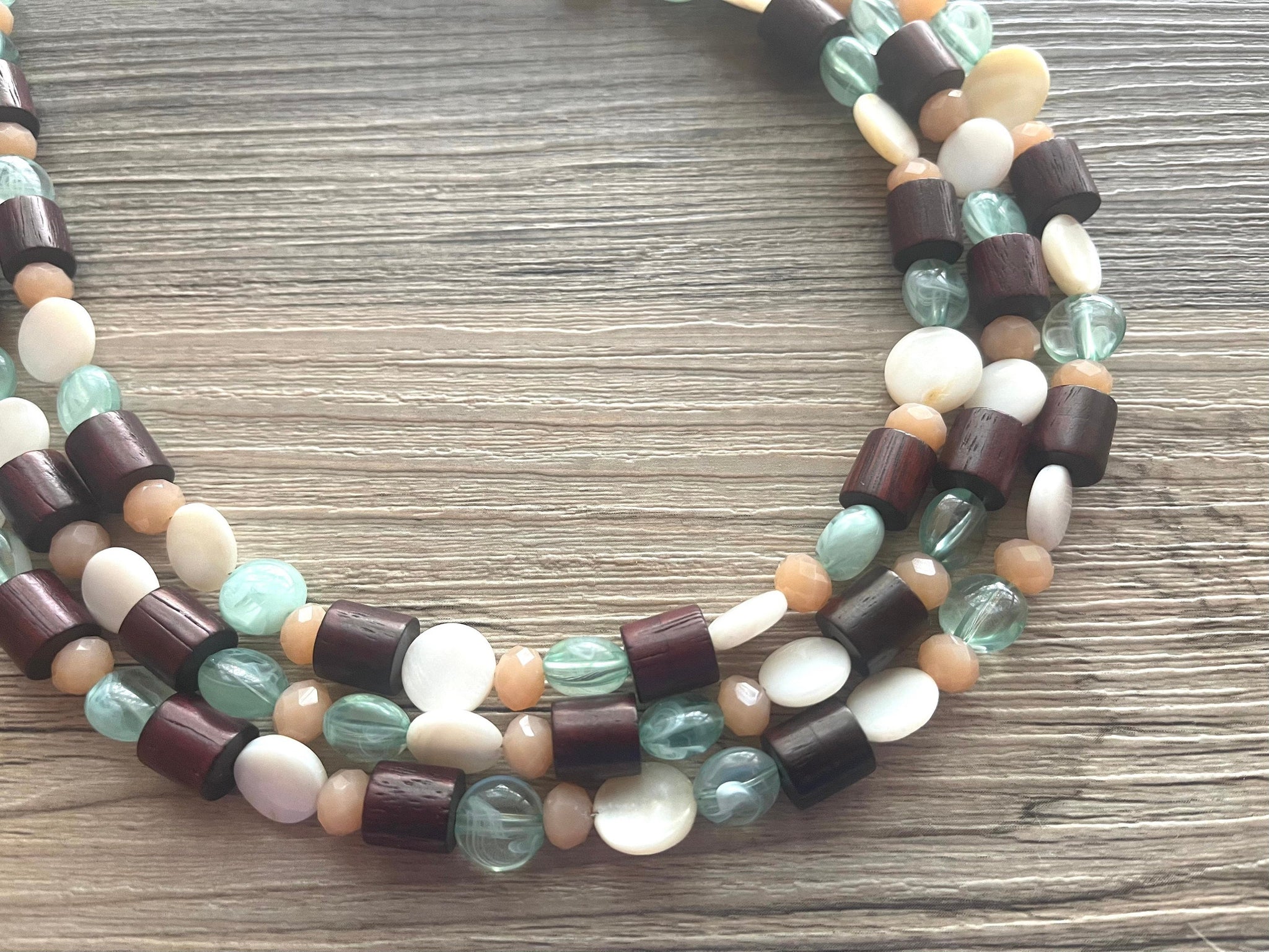 A confetti collision of creamy green acrylic beads, cinnamon wood barrel beads, caramel faceted crystals, and white shell beads!