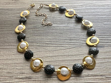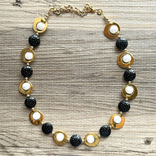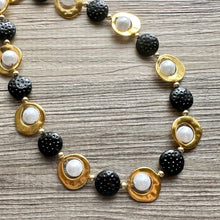 16 Inch Necklace with a 4 inch gold extender chain and gold lobster clasp. Striking, gorgeous one of a kind beads adorn this chunky necklace. It is made with slightly off white pearl beads, golden mirror circle in circles, and glass black polka dot beads.