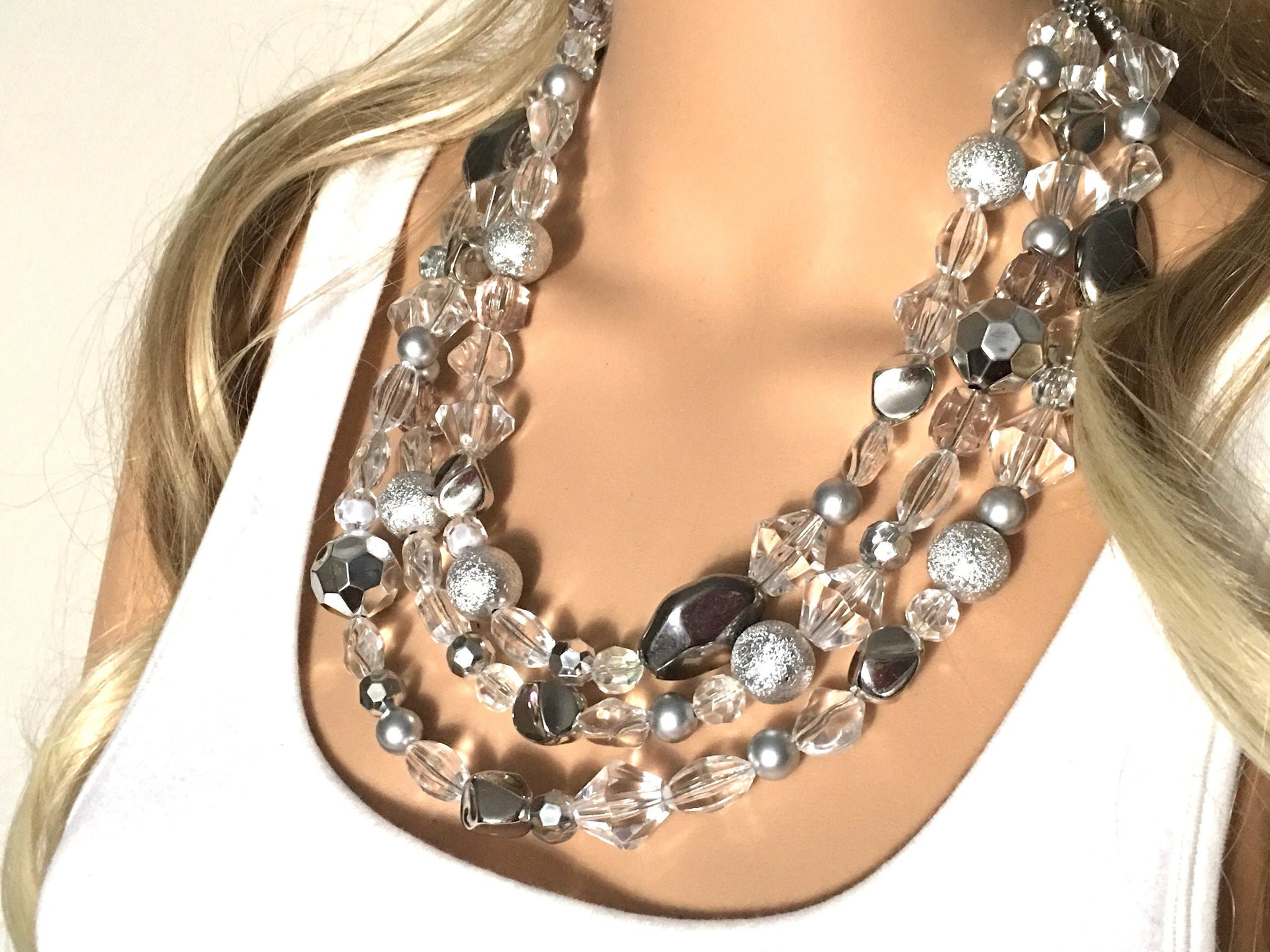 Silver and Clear statement necklace, lucite necklace, resin necklace, clear three strand chunky jewelry, silver Beaded Holiday Necklace