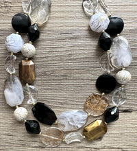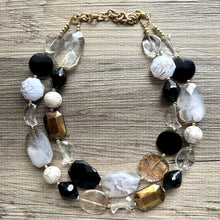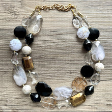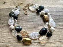 Black Gray & Gold Necklace, double strand gold jewelry, big beaded chunky statement necklace, black necklace, gold jewelry