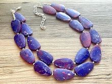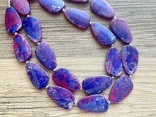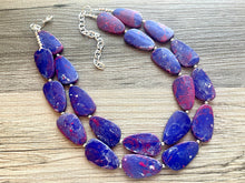 A great statement piece! Two of layers of magenta, white, and blue hand painted Acrylic beads. Each bead is spaced with a small silver bead to give this a polished look!