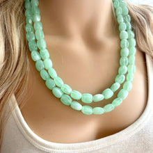 A great statement piece! Three layers of light green acrylic beads with silver accents.