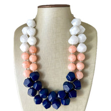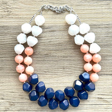 Summer Peach & Navy Blue Necklace, multi strand colorful jewelry, big beaded chunky statement necklace, navy blue white coral jewelry