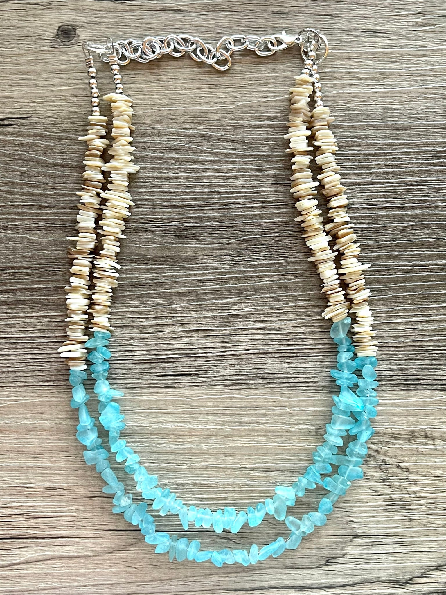 A great statement piece! Long double strand of spiky shell beads + light blue beads.