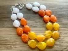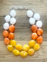Dress up any outfit - great for a night out or with a white tee! 16 Inch Necklace with a 4 inch silver extender chain and silver lobster clasp. This is an eclectic bunch of acrylic beads in orange, yellow, and white. A total conversion starter!