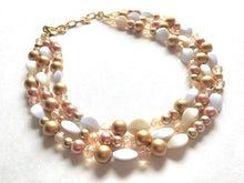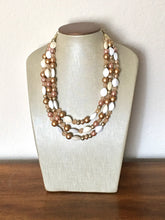 Gold statement necklace that is a real conversation starter! Creamy shades of white, rosegold, toffee, and white combine to make a beautiful jewelry piece that never goes out of style.