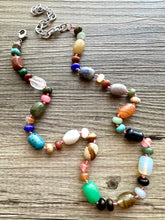 Polished Agate Genuine GemStone Necklace rainbow, silver statement necklace jewelry, long beaded statement layering beaded stone colorful