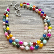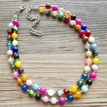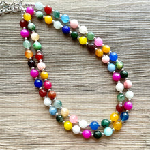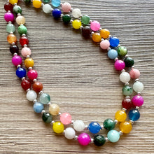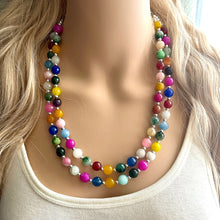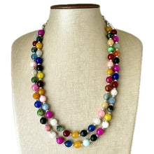 Polished Agate Genuine GemStone Necklace rainbow, silver statement necklace jewelry, long beaded statement layering beaded stone colorful