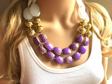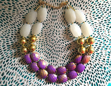 A great statement piece! Two of layers of beads in golden dipped purple, gold globe beads, and white faceted beads. Each acrylic bead is spaced with a small gold bead to give this a polished look!