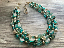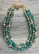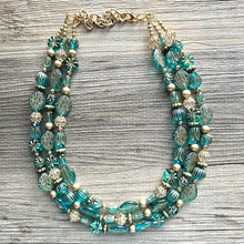 Turquoise Blue & Gold Beaded statement necklace, 3 strand bead jewelry, green teal geometric light blue winter bib chunky necklace metallic