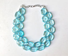 Acrylic beaded necklace made with pretty blue beads that have a look of stained glass but durability of acrylic.