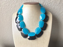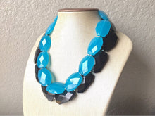 This gorgeous multi-faceted beaded necklace is shown in purple and black. In between each big bead is a small silver bead.