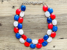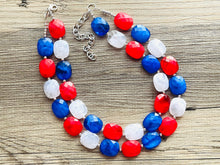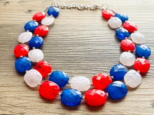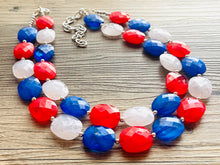 A great statement piece! Two of layers of red, white, and blue translucent beads that are multi-faceted so they catch the light beautifully. Each acrylic bead is spaced with a small silver bead to give this a polished look!