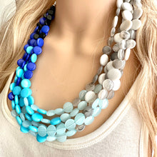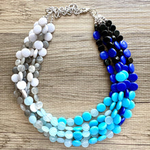 5 layer striking statement necklace, made with a medley of acrylic and glass blue beads in various sizes.