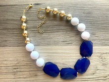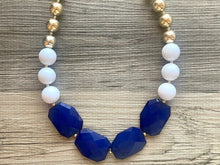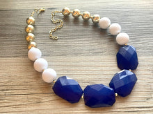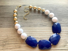 Acrylic beaded necklace made with white and blue faceted beads and a pop of gold for a modern, funky color block look.