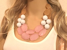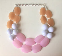 Acrylic beaded necklace made with a center section of pretty blush pink faceted beads and a pop of white for a modern, funky color block look. We add a chic layer of champagne to tie the piece all together for a sophisticated look.