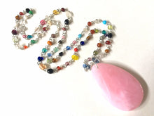 Blush Pink Pendant Necklace in Rainbow glass beaded chain, Long acrylic teardrop jewelry, ash white necklace, pink jewelry pride colorful