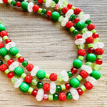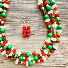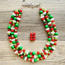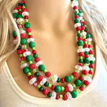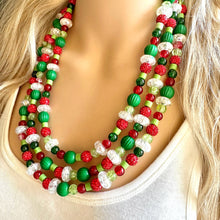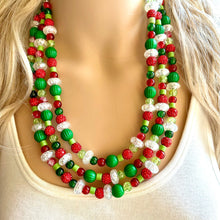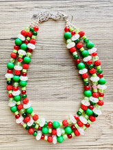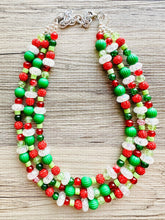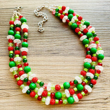 Great necklace for the holiday season! Various shades of red, silver, and green acrylic and glass beads in our signature confetti style :)