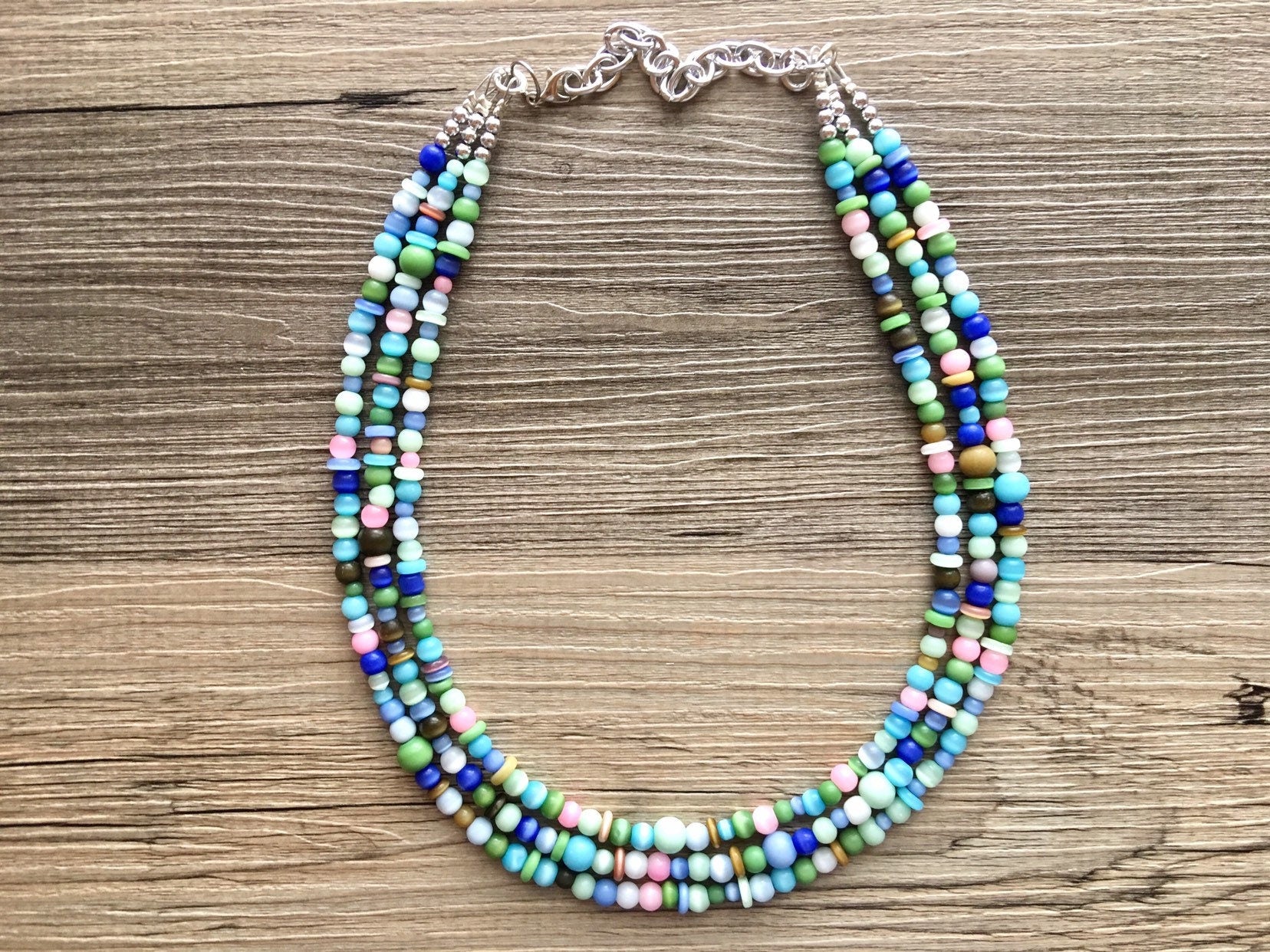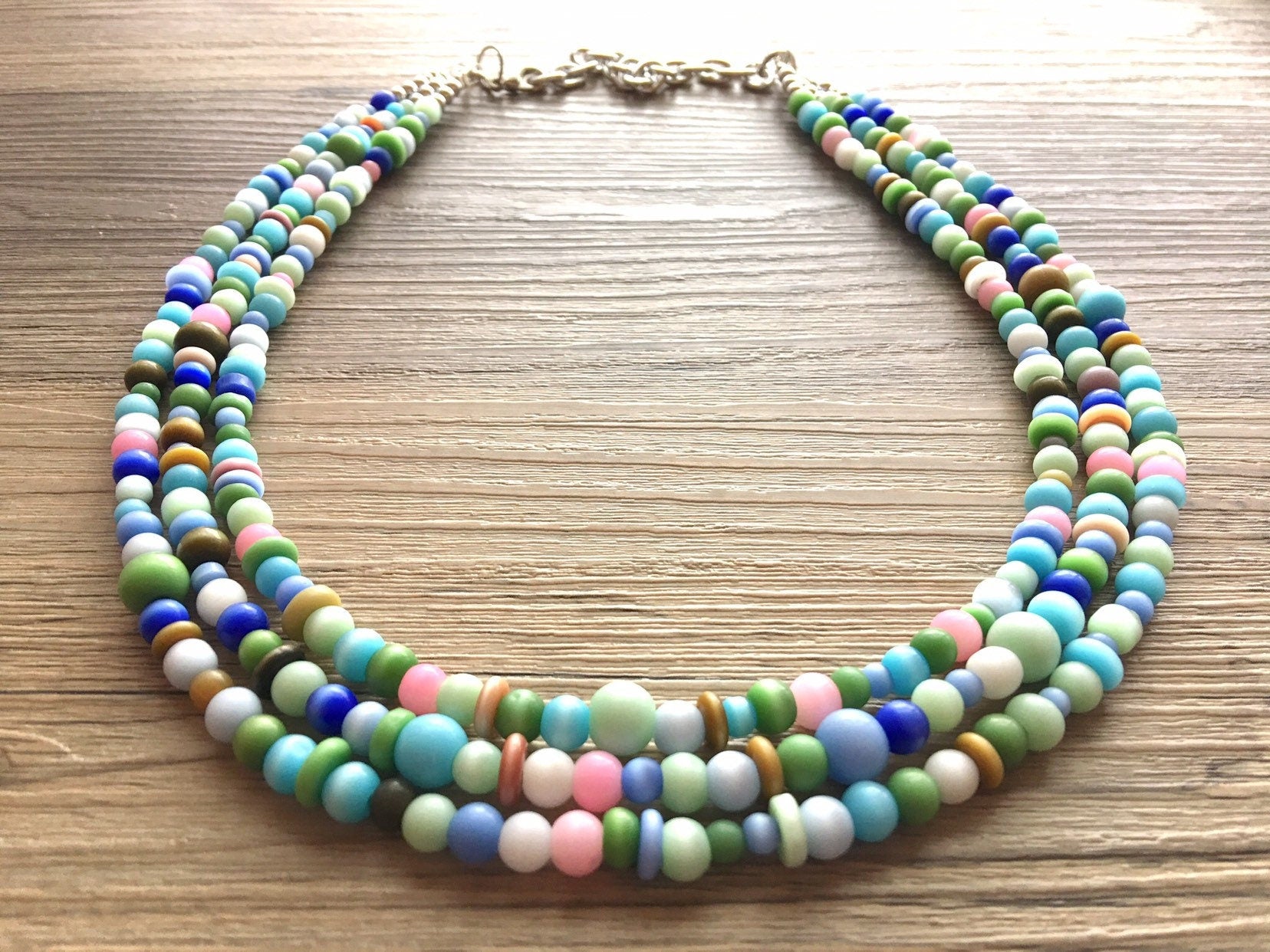 Chunky Jewel Tone Glass Statement Necklace, multi Strand Beaded Jewelry, Blue & Pink jewelry, brown necklace, blue green ball necklace