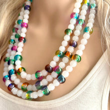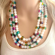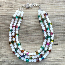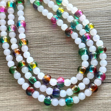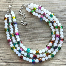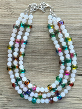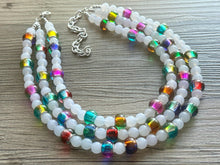 Colorful block beaded necklace in rainbow colors. Silver finishing. Made with a mix of glass and acrylic beads.