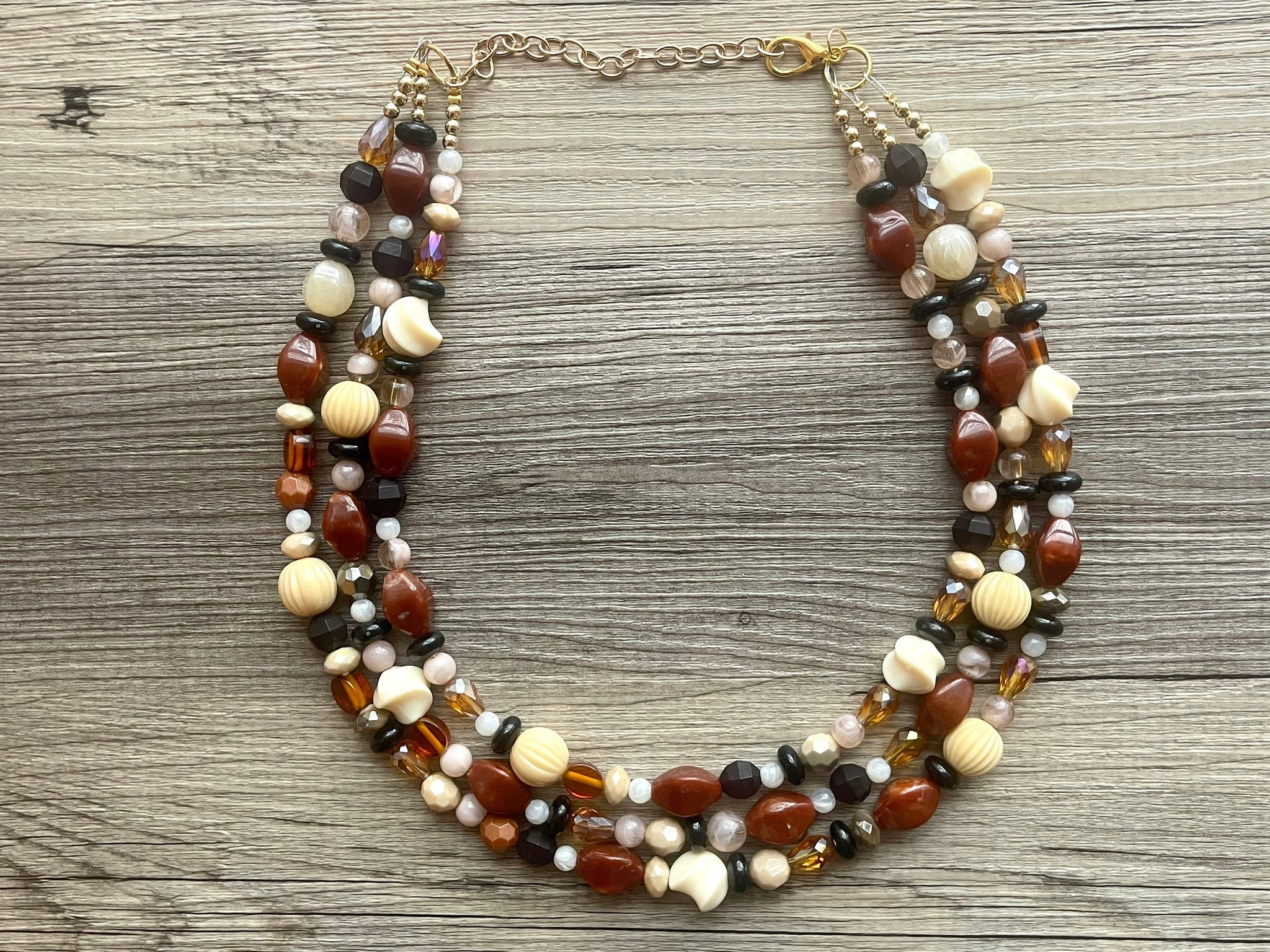 Dress up any outfit - great for a night out or with a white tee! 16 Inch Necklace with a 4 inch gold extender chain and gold lobster clasp. This is a fiesta of neutral shades, originally designed to match a pair of brown boots! Three strands of acrylic beads for a chunky look. A total conversion starter!