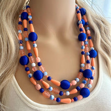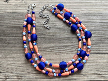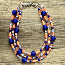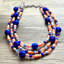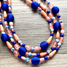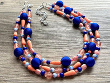 3 strand chunky necklace makes a great statement piece! Glass, acrylic, and threaded beads with silver finish.