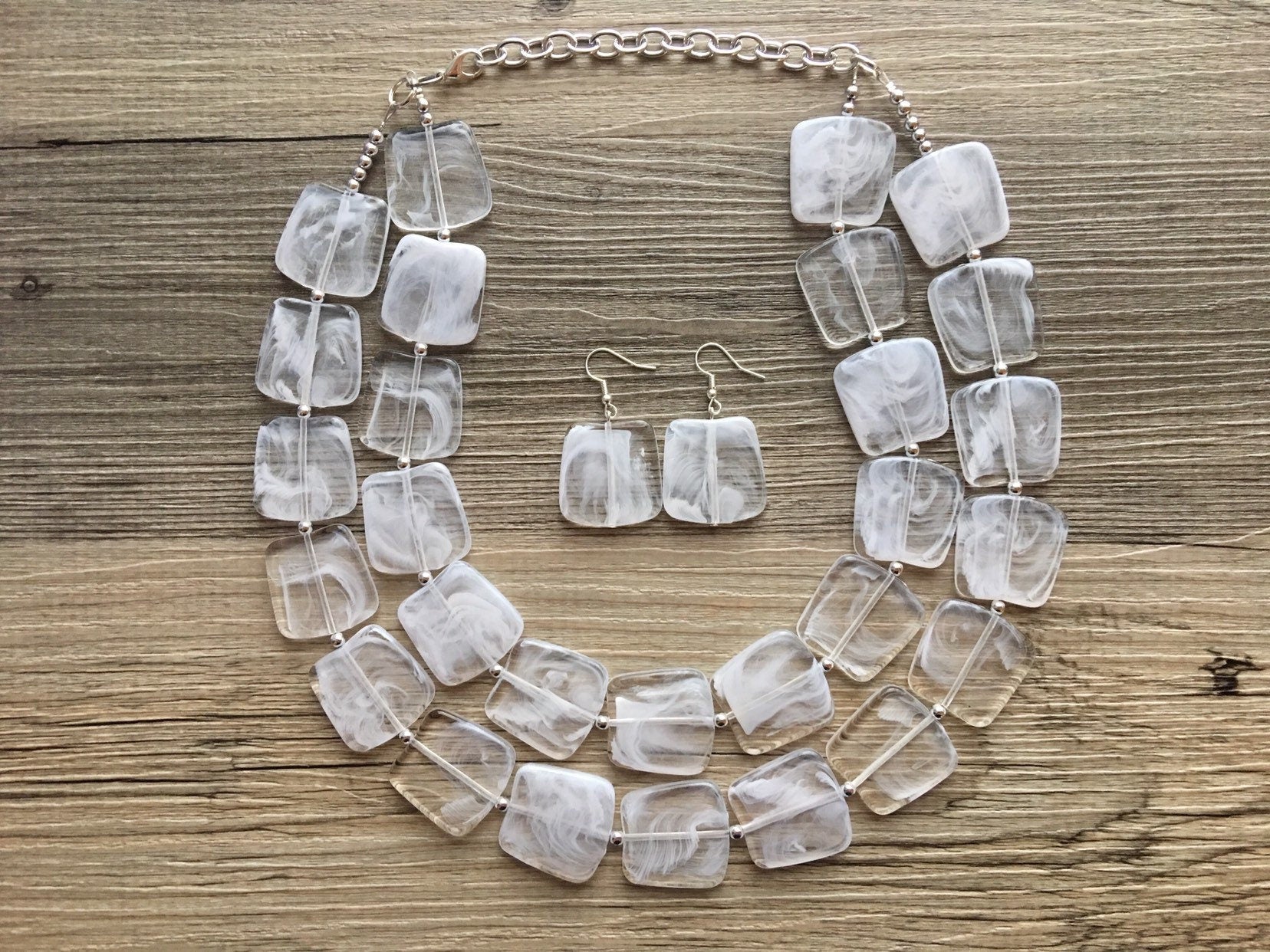 Double Layer White Cloudy chunky statement necklace, bib jewelry cloudy white necklace, white jewelry, white beaded necklace, white
