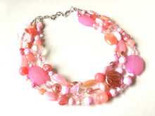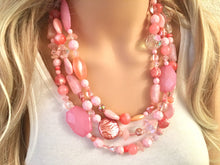 This colorful THREE strand chunky necklace makes a great statement piece! Adorned with shades of pale pink and coral this piece can be worn all year long.
