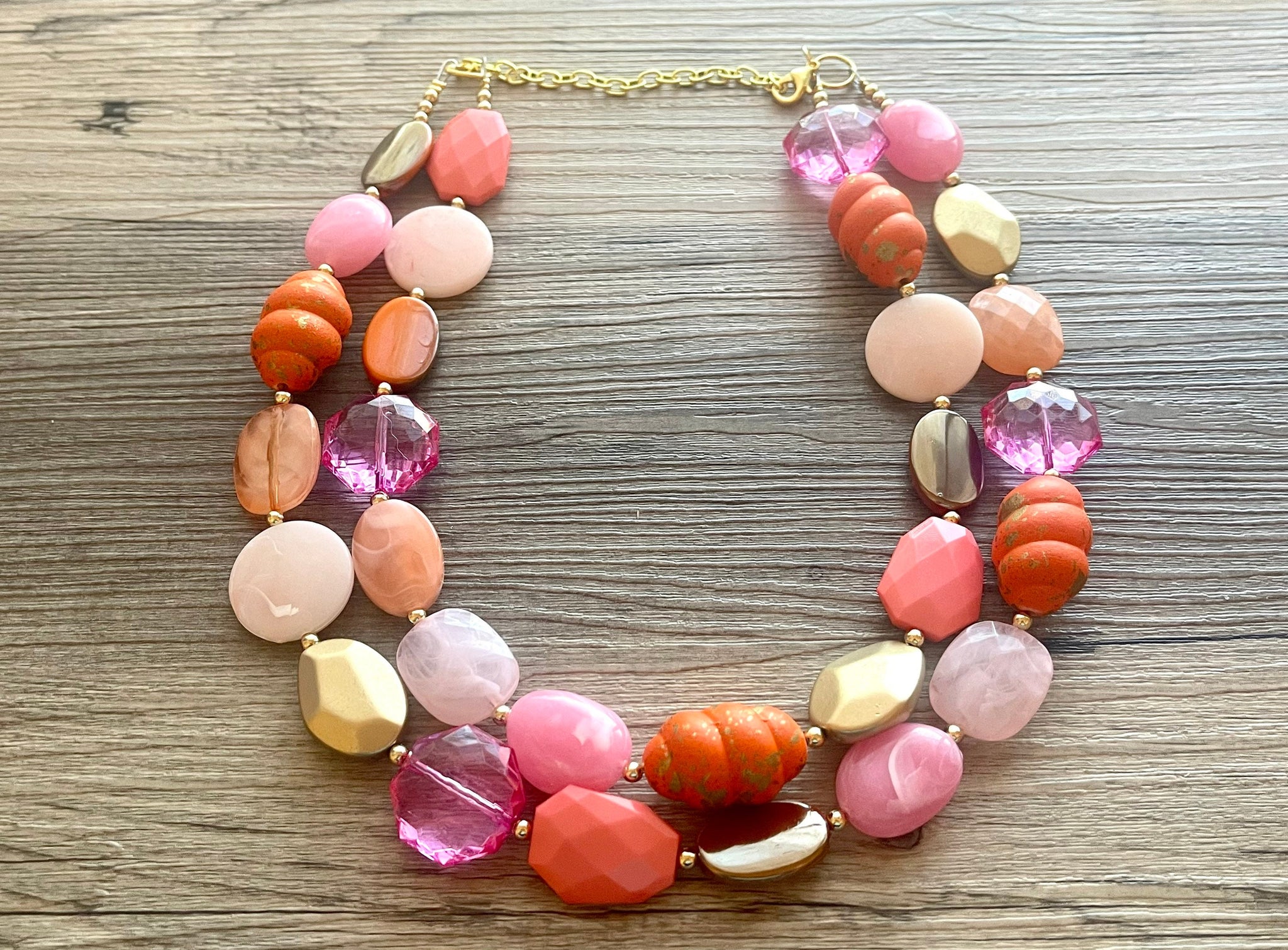 Dress up any outfit - great for a night out or with a white tee! 16 Inch Necklace with a 4 inch gold extender chain and gold lobster clasp. This is an eclectic bunch of acrylic beads in orange and pink. A total conversion starter!