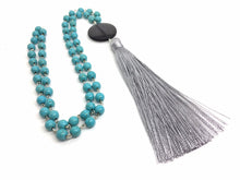 A great statement piece! Long necklace that begins with turquoise beads that have been assembled each by hand into a 30” long strand. We them attached a creamy, gray circle bead atop a long silk gray tassel. Lots of glamour!!