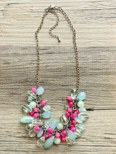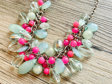 Green & pink Cluster Necklace, silver and green beaded necklace, holiday jewelry, neon pink crystal necklace bib statement Necklace